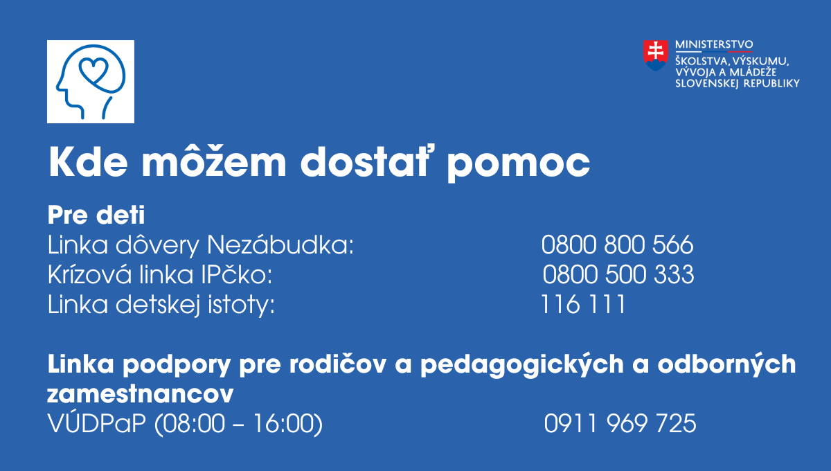 Ak sa ako učiteľ/učiteľka alebo rodič obávate o zdravie dieťaťa, môžete sa obrátiť na školský podporný tím, centrum poradenstva a prevencie alebo krízové linky pomoci: